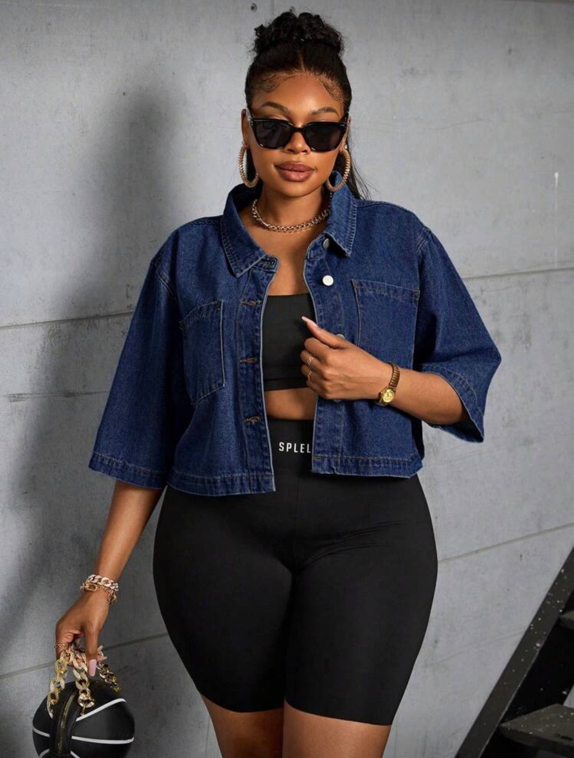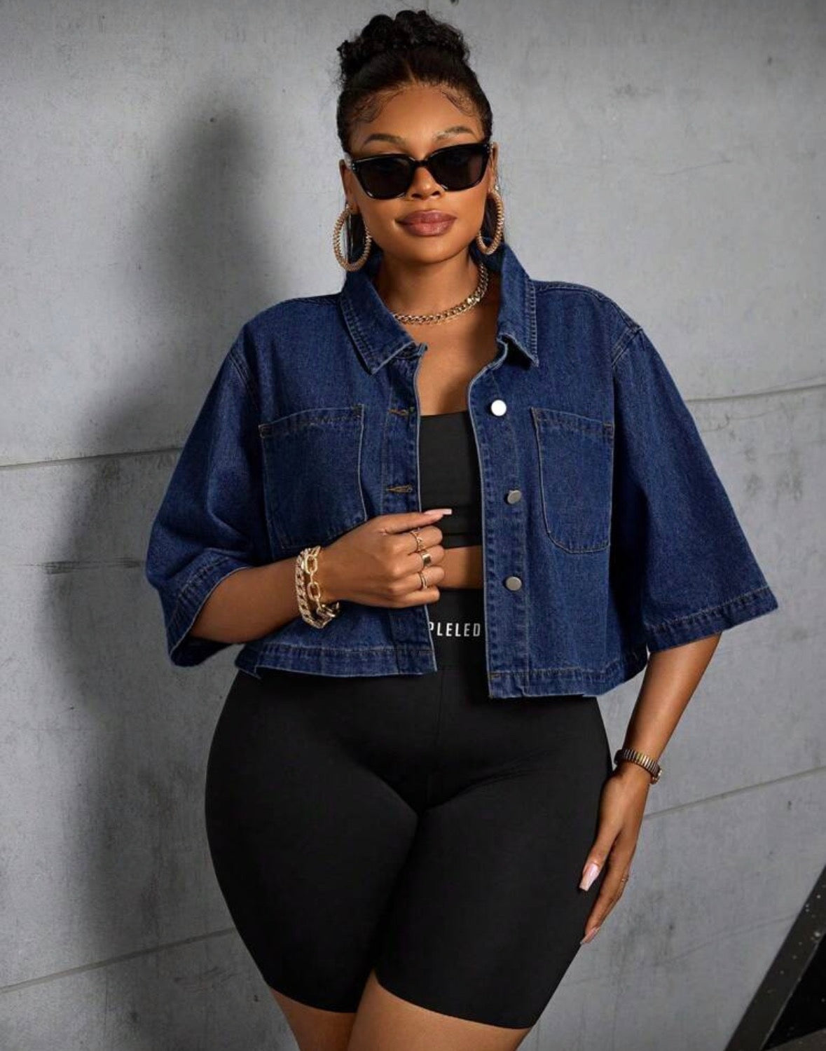 Dark wash cropped button collar shirt for women