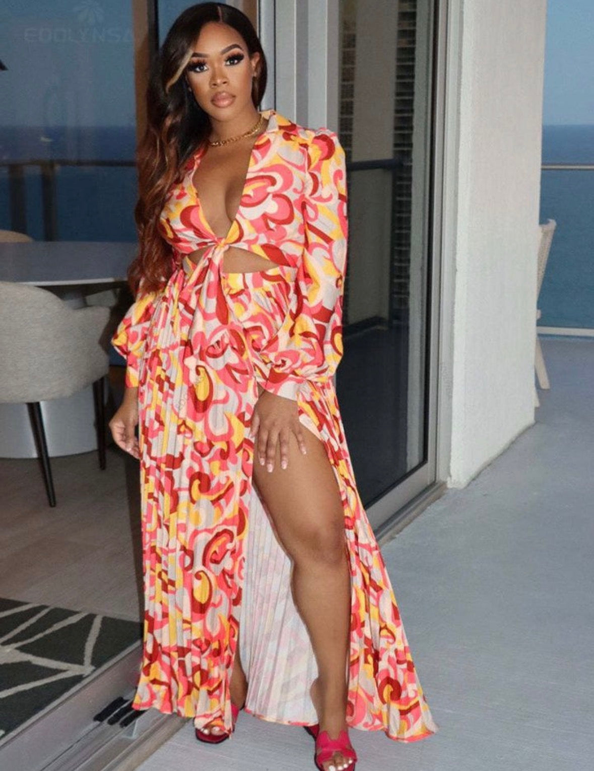 Women’s open leg skirt long sleeve top, tie and multi design long dress